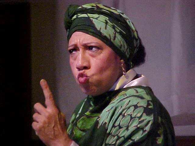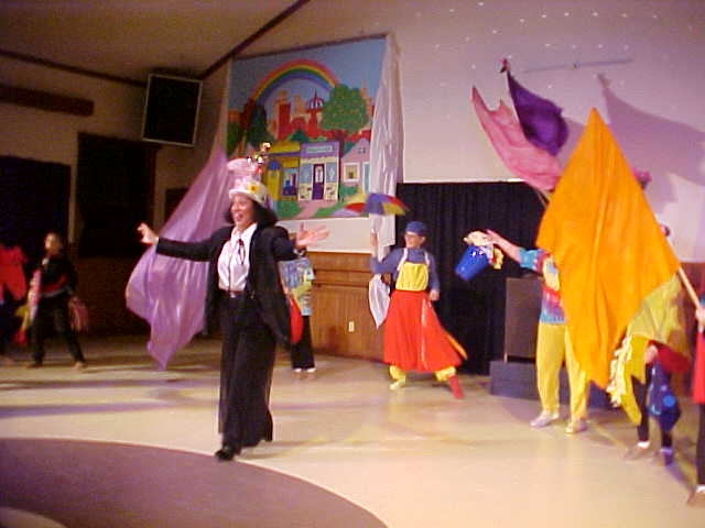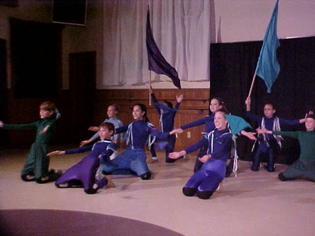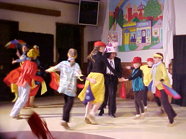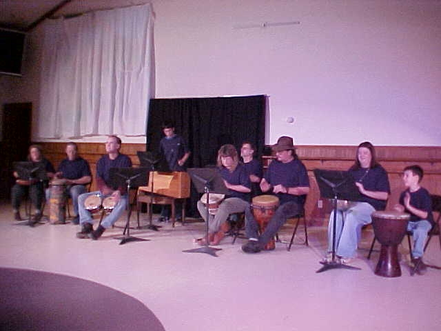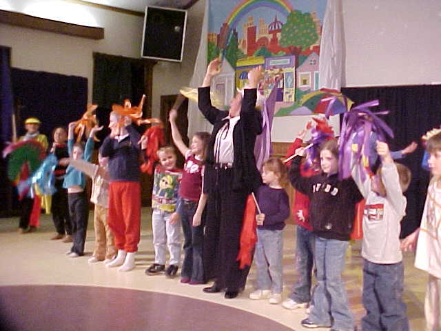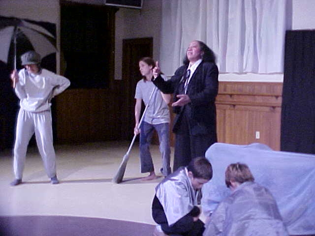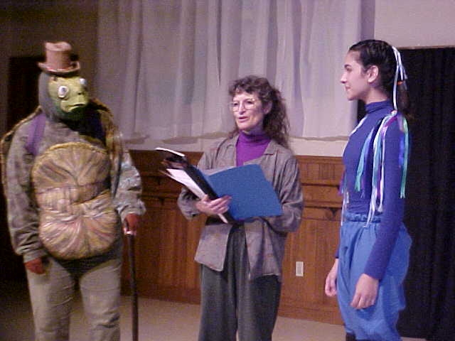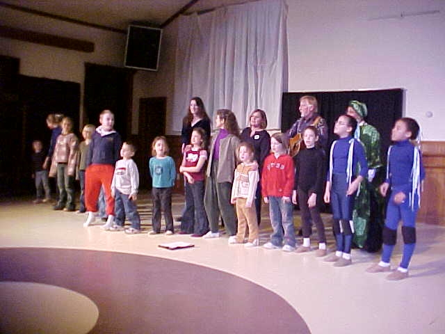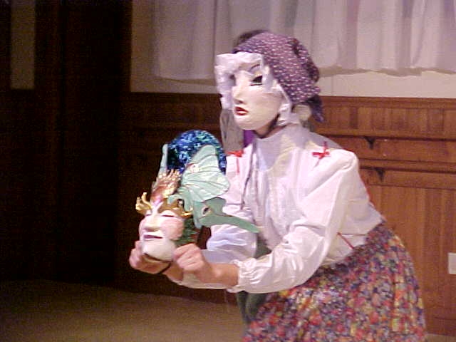 Artistic Director Jude Binder with Heartwood Turtle recognize students By Bob Weaver Calhoun's Heartwood in the Hills lifted spirits last night with their eleventh annual December Celebration. Heartwood's Artistic Director, Jude Binder, whose never-ending enthusiasm and talent engages both her students and the audience, welcomed visitors to Heartwood. The featured performance was "The Great Blueness," adapted from the children's book by Arnold Nobel, with Ilene Evans as "The Wizard." It filled the stage with movement and music. The story centers on the discovery of color, from a life filled with blue to the brightness of a rainbow. From Michael Franek's engaging "Percussion Discussion" group to a moving dance number choreographed by Jude Binder "Bond Between Women," the audience shook, clapped and cheered. The performances were highly skilled, well delivered and importantly, an audience pleaser. Also on the program was a dance number "La Lluvia" and "Wonderful World," creative arts for children with Binder, Steve McCormick and Stephanie Curry. Performer Ilene Evans engaged the Heartwood audience with her music, storytelling, and acting, during an opening introduction and later in "The Great Blueness." She first performed in Chicago, but is now a West Virginian, known for "Voices from the Earth" and "Creative Links." Last night's performance concluded her week long residency at Heartwood, where she was a guest teacher in several Heartwood classes, plus visits to Pleasant Hill and Arnoldsburg schools. Binder reminds every listener "The motivating philosophy behind all of Heartwood's work is that the arts belong to everyone, and that the artistic gift in each person deserves nurturing." "We give all students an equal opportunity to shine," she said. Heartwood has been a shining light in rural Calhoun County since 1982. Heartwood presented certificates of accomplishment to students who have studied at the center, aided by the Heartwood Turtle. Guests spent the earlier part of the evening in the center's art department, viewing mask making and other projects.