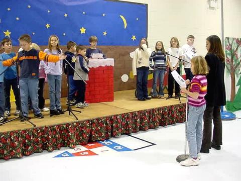 Kristi Ritchie with students rehearsing the play Students at Pleasant Hill School are rehearsing for this year's Christmas play, The Littlest Reindeer. It's Christmas at the North Pole and everyone's getting ready for Santa's 'round the world jaunt. The littlest reindeer has been told that this is his chance to join the team and help Santa. Everyone is skeptical that such a little critter could possibly be of much use on so important a night. But by the end of the story they realize that everybody has something to offer in the quest to make the magic of Christmas real. Every grade -- preschool, kindergarten, first, second, third, and fourth -- will sing a song that will tell the story. A dozen students from almost every grade have speaking parts in the play. John Bugby, music teacher, has been practicing the songs with each grade. Kristi Ritchie, kindergarten teacher, has been rehearsing with the students who are in the play. Kim Batten, PE teacher, and Steve Albaugh, speech therapist, have been assisting with the practices and rehearsals. Parents, relatives, and friends are invited to see The Littlest Reindeer at 9:30 a.m. Tuesday, December 23 in the Pleasant Hill gym.