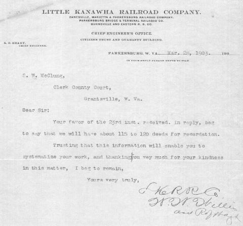 Letter requesting the recording of rights-of-way RAILROAD MONEY FOR LITTLE KANAWHA RAILROAD FALLS THROUGH Washington, D.C. (About 1912) - The story of how $5,000,000 were spent the Little Kanawha valley in the construction of what was intended to be one link of a transcontinental railroad; how the failure to obtain funds necessary; the abandonment of the work, and the diversion of what funds could be obtained to the construction of a short railroad south from Pittsburg to tap northern West Virginia and Pennsylvania coal land; and how the coal in the upper Little Kanawha valley has largely passed into the hands of persons not interested in the extension of the Little Kanawha Railroad, was told by witnesses before Chairman Harlan of the interstate commerce commission today. The hearing was on Senator Chilton's resolution for an investigation as to the ownership of the Little Kanawha Railroad and the intention of its owners regarding its extension. Joseph Ramsey, organizer of the Little Kanawha syndicate and formerly right hand man for the Gould; Colonel J.T. Blair, former president of the Little Kanawha railroad; S.D. Brady, chief engineer of the same road; H.C. Jackson of New York; Hugh L. Bond, of the Baltimore and Ohio railroad, and others were before the commission. Mr. Ramsey testified that he, William E. Guy and George J. Gould composed the syndicate managers of the syndicate which purchased the road; that they intended to construct a line from Zanesville, Ohio, by way of Parkersburg, to a connection with what was then the West Virginia Central, near Belington, but that they intended to ship coal to the west only. George J. Gould subscribed $2,000,000 to the syndicate; Davis and Elkins the same amount, although they did not take all the stock they agreed to take, while many other persons made up the rest of the $7,500,000 with which it was intended to build the connecting link in the transcontinental line. After about $5,000,000 had been spent it was found the work could not be completed for what they had, and it was abandoned, all of the available funds being used then to build the line south from Pittsburg. Then Colonel J.M. Schoonmaker became interested in the property and parties represented by him bought the Little Kanawha Syndicate for $8,500,000, which merely netted the stockholders interest on the amount put in. He told how he helped Elkins and Davis to get $20,000,000 for the West Virginia Central, when they had been about to sell for $18,000,000. W.W. VanWinkle and Joseph Ramsey told of the purchase by R.C. Kerens, H.G. Davis and S.B. Elkins of thousands of acres of coal lands in the Little Kanawha valley and of their interest in shipping it eastward over their own railroad rather than west through the Little Kanawha valley. Colonel Blair said it had been in his hands for nearly two years, and that several times in that period he thought the road was sold, once having been sent for to come to New York to accept an initial payment of $500,000 on the purchase; that it had fallen through. He said there is now a New York party negotiating for it and that parties represented by Sam A. Hars, of Parkersburg, are also considering its purchase. He insisted that there has been no intention of preventing the development of the Little Kanawha valley, but that the present owners did not feel that the business of the valley would justify the expenditure of several million dollars to extend the road. He did not think the extension to the coal lands could be profitably constructed and operated without direct connection to the lands, although he thought there might be a chance to market the coal by making Parkersburg a shipping point, taking coal there by rail and loading it there for shipment by water. He said the Little Kanawha road had been operated by its present owners at $2,000 a month. He said the property of the Little Kanawha syndicate known as the Buckhannon and Northern, and the coal holdings in the northern part of the state and in Pennsylvania, are now for sale and that the purchase of the entire holdings of the company, including the Little Kanawha road, was mainly to get hold of his part of the property which is not now desired to sell. S.D. Brady, chief engineer for the Little Kanawha syndicate since 1901, testified that he believed not more than 20,000 acres of coal could be made available for the Little Kanawha road if built along the proposed line. He said there are about 125,000 acres in the Little Kanawha coal basin, but that 45,000 acres is held by owners of the Coal and Coke road and could be shipped over their road, and that the largest part of the Little Kanawha holdings lies close to the Baltimore and Ohio, some of it as close as six miles, and could be shipped by Weston and Clarksburg to better advantage than on the Little Kanawha valley, where it would take twenty-five miles of branch road to reach it. He said the tonnage is not in sight to justify the expenditure necessary to extend the Little Kanawha road and put it in shape to compete with other railroads. Mr. Brady estimated that it would cost $200,000 to connect the Little Kanawha with the Baltimore and Ohio at Parkersburg and $350,000 to reconstruct the road and put it in shape for hauling coal. He was of the opinion that it would take about $5,000,000 to extend the Little Kanawha railroad as planned, and put it in good shape for heavy hauling.