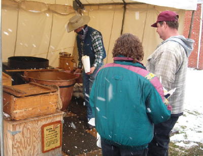 ![]() The sap is then taken to a sugar house where it is boiled down in large evaporating pans making the thick, golden syrup. Here's the killer. It takes about 45 gallons of sap to make one gallon of maple syrup. The hot syrup is then filtered and packed into storage jugs. The 2004 festival had lots of visitors yesterday, even through the chilly temperatures. They are use to it at Pickens, which is in one of the state's snow belts.