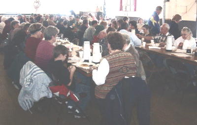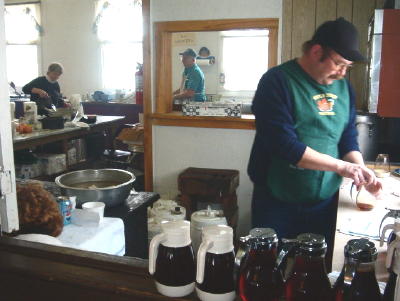 "Ladies keep you filled-up with pancakes syrup, sausage, milk, coffee, butter and cream and keep the tables set for new guests it is a full time job, the building is heated by a wood stove," says Bernard Taylor