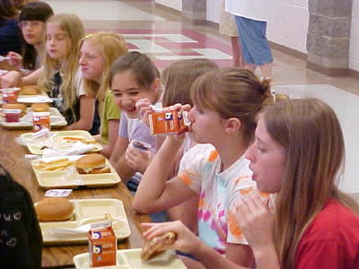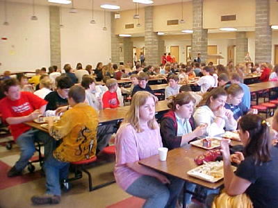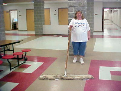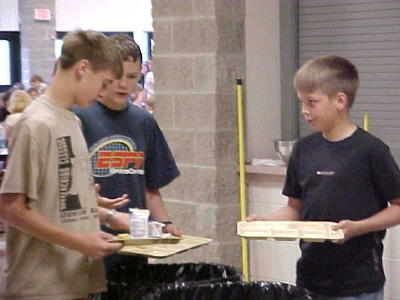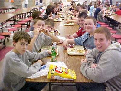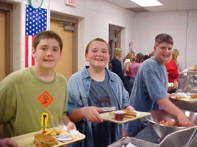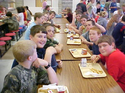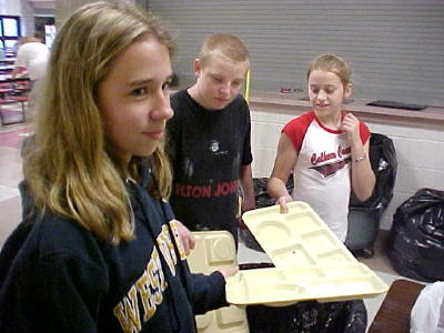 Custodian Marisla Collins gets ready for the next round School custodian Marisla Collins said "They're pretty wound up today," speaking about Calhoun Middle School kids eating lunch. "They just got through with the WesTest and being exciting about the Science Fair." Calhoun Middle-High School runs a lunch program in which most students eat, and it's a rather awesome task to get them through the lunch line and have thirty minutes to eat. The school has three lunch schedules, the first for high school students, the second for fifth and sixth graders and the third for seventh and eight graders. The students went through the lunch line in an orderly manner, rather quickly. "They're a great group of kids," said Joann Heiney. LUNCH BUNCH SCRAPBOOK