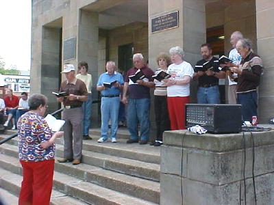 Pastor Mary Zimmer says "Let Freedom Ring" "Let Freedom Ring,"based on Leviticus 25:10, "â¦proclaim liberty throughout the land to all its inhabitants," was the theme of the 53rd National Day of Prayer held in front of the Calhoun courthouse yesterday. The event was sponsored by the Minnie Hamilton Volunteer Chaplain's Association. Pastor Mary Zimmer said "The vision of the theme is to encourage believers to take advantage of their constitutional rights to gather, worship and pray." "We are one nation under God, indivisible, with liberty and justice for all. We have the freedom to gather, the freedom to worship and the freedom to pray. Therefore, let freedom ring!" she said. The CCCOA choir sang for the event and food was served by volunteers with all proceeds going to the Community Food Bank at the First Baptist Church in Grantsville. "We will lift up the leaders of our country, state, county and city in prayer; our children and their teachers; our peace officers, those serving the military and the veterans who have sacrificed to serve our nation." The National Day of Prayer has been set aside for a time of prayer since 1775. It began when the Continental Congress designated a time for prayer in forming a new nation. In 1863, Abraham Lincoln called for such a day. Officially, the National Day of Prayer was established as an annual event by an act of Congress in 1952 and was signed into law by President Truman. President Reagan amended the law in 1988, designating the first Thursday of May each year as the National Day of Prayer. Thousands of Americans across the nation participated across denominational differences in a spirit of unity and power.