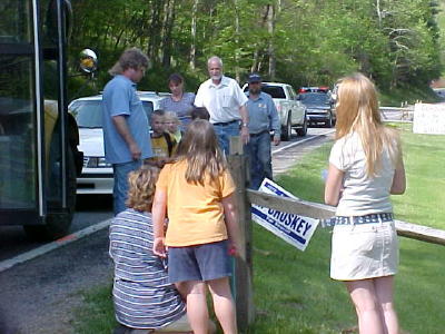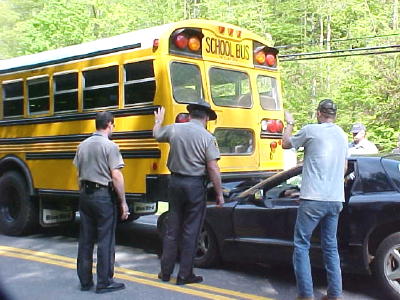 Sheriff Allen Parsons assists with accident An auto struck the rear end of a Calhoun school bus yesterday evening, after it had stopped to let children exit. None of the 25 middle and high school children nor the driver and a passenger in his car were injured. "We were fortunate that the accident produced no injuries," said school administrator Donnie Pitts, who came to the scene. The accident happened on Phillip's Run about three miles south of Grantsville on State Route 16. Bus number six was traveling north on 16 shortly after school was dismissed. Sheriff Allen Parsons said driver Brandon Sampson struck the bus, causing extensive damage to his vehicle. He said it was wedged under the school bus. Calhoun EMS responded to the accident, with emergency workers boarding the bus to examine the children, who were later placed on another bus to continue their trip home.