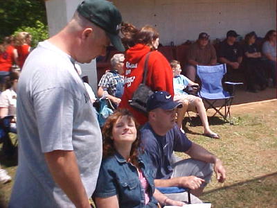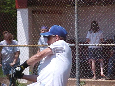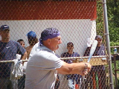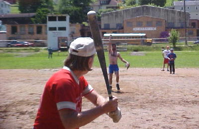 Building sign says "Old folks sports creme room. Thanx, Come again!" Courtesy of Kari Frame Some of the players looked good, at least for a little while at Saturday's oldtimers softball game at Wayne Underwood Field. It was a fund-raiser for the girl's softball league, with a wide array of local "oldtimers" including Calhoun County Sheriff Carl Ballengee. Coaches for the teams, Trooper 1st Class Jeff Hunt and Chief Deputy Ron Bandy. Some looked stiff and crooked when they batted and trotted out to first base. Some grimaced with pain and put on edgy smiles when they sped around the bases. Some presented 40 plus profiles with t-shirt covered bellies, but hid their thinning hair with those wonderful baseball caps. Some had to ask for runners after they got on base, accepting their out-of-shape condition. But without exception, come Sunday, it is likely they were running down to the store for Absorbine Junior. It was great fun, and some of the guys and gals really hit that ball into the outfield. UP TO BAT