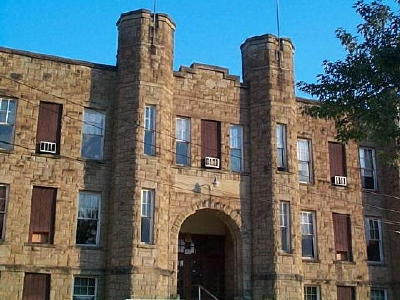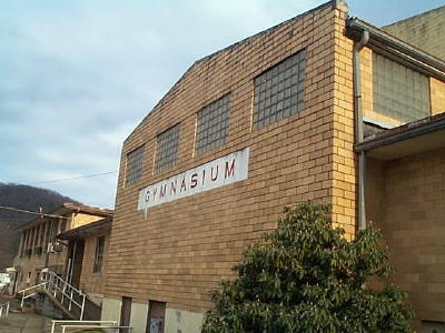 The old gym, which doubled as an auditorium There are 22 days left on an eBay auction of the old Calhoun County High School. So far, there are a few bidders, with a minimum bid of $85,000. The eBay description of the building: Old Calhoun County High School. Located on 2-Acres of land in Grantsville, Calhoun County, West Virginia. Three-story building constructed of native hand cut Arnoldsburg Sandstone. Building was constructed in 1921 - 1925. Walls are brick. Outside walls are covered with 7" stone veneer. Inside walls are covered with 1" plaster. The main building is basement, first floor, and second floor of approximately 26,000 sq. ft. The main building is covered outside with 7" thick hand cut stone weighing approximately 600 tons. ~Additional Buildings~ Gymnasium 87' x 67' floor has been partially removed. 6 banking boards, 2 glass, 4 practice. 2 natural gas fired heating and air condition units that were working when school was closed in June 1998. The main electrical boxes both buildings are 250-V AC or DC - 600-V Square D Boxes, additional boxes throughout buildings. The buildings are asbestos free, testing was performed by Asbestos Testing - Charleston, WV March 2005. Real estate taxes are $700 per year. There is approximately $40,000 worth of 2"x14' lumber that could be salvaged if buildings were dismantled, also lots of steel-salvage value at .50 per pound.