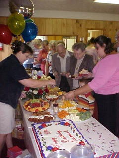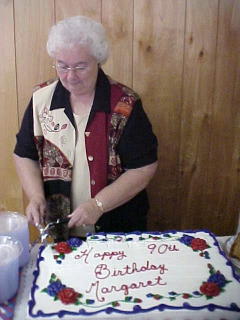 Children Larry and Leanna return for event An open house and birthday party for longtime Grantsville resident Margaret Cunningham was held Saturday at the Pleasant Hill UM Church. The normally energized Margaret was even more energized as the crowd assembled to honor their friend. Margaret, when asked why she has lived so long, responded by giving some advice - "Don't sit down!" Margaret, a fixture in south Grantsville, is a doer, always helping out and exuding excitement for the gift of life. She is a member of the Veterans of Foreign Wars and Friends of Minnie Hamilton, auxiliaries, and belongs to the Order of Eastern Star #73, Sunny Cal Gals Red Hat Society, and participates in daily activities at the CCCOA's Senior Center. She is a member of Pleasant Hill UM Church. Margaret's husband, Gerald D. "Cap" Cunningham, died in 2001 at the age of 85. he and Margaret had been married 62 years. Margaret has two children, son Larry and his wife Jane Cunningham, a daughter, Leanna and her husband Ray Jobin, four grandchildren and five great grandchildren. The event was sponsored by her church family and friends. It is still not too late to send her a card: Margaret Cunningham, PO Box 62, Grantsville, WV 26147.