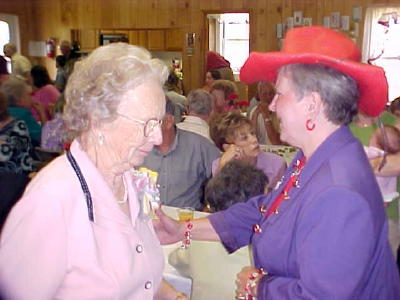 ... greeting guests at Pleasant Hill, including her Red Hat friends...