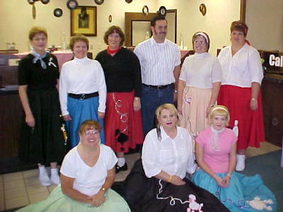 Main Floor employees were rockin' with their 50's soda fountain The employees of Calhoun Banks returned to an earlier tradition this week, celebrating Halloween. Bank employees used a 50's-60's theme throughout the bank, and the competition between departments was "severe."