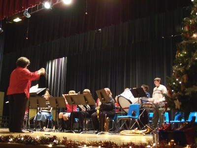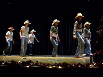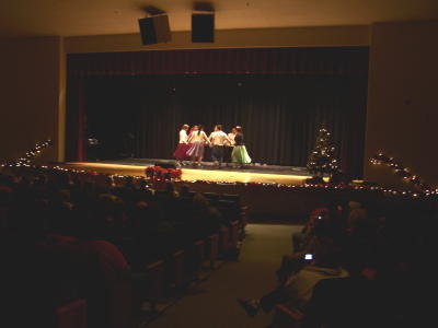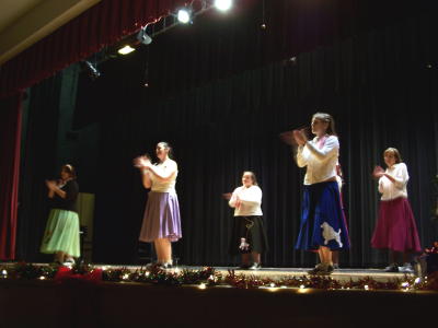 Rockin' to those 50s tunes "A Christmas Potpourri" was a special Christmas evening of entertainment at Calhoun High last night, presented by the Fine Arts Department. The production featured the band, dancers, choir, theater and art department. The choir performed "Sing Joy," "Baby's Born in Bethlehem," "Lift up your Voice," and other songs. Briana Blankenship and Harry Rich, GSC professor emeritus, performed trumpet duets. Katie Walker did a stage "Tapestry Drawing." The school band performed "Happy Christmas Holiday," "He Comes Santa Claus," "Let it be Snow," and other other numbers. Dance groups presented line dancing and 50s rock 'n roll, and the theater group performed "Dorthy Meets Alice."