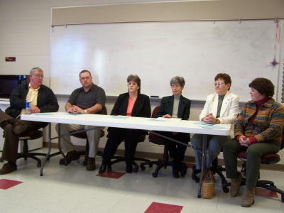 ![]() School board candidates answer questions (left to right) Lee Evans, Mike Wilson, Sandra McCumbers, Juanita Berdine, Carlene Frederick and Donna Richards (Not pictured was Steve Whited, who had to be absent, but sent a statement to be read)