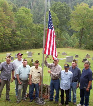 |  Calhoun's veterans of foreign wars - VFW Post 5959 of Grantsville - were back to erecting flag poles and flags yesterday, this time at the Kight Cemetery at White Pine. The Kight Cemetery is located in a remote, wooded area on a hillside, with some of the communities originals buried there, like Hickman, Webster, VanCamp, Ayers, Kelley, Simers, Ferrell and Gainer. Post members are planning on erecting at least one more flag pole and flag before winter sets in. |