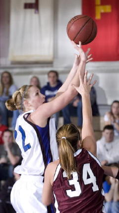 ![]() (R) Lady Pioneers senior Christy Alltop hits for two during Thursday night's win over OVC in Parkersburg. Saturday night Alltop hit two critical back-to-back buckets as Concord whittled away Glenville's lead. Alltop is the daughter of Roy and Rhonda Alltop, both Gilmer County High School graduates. (Photos by Drew Moody) Glenville State (15-2, 6-0) remained unbeaten in West Virginia Conference play with a 77-60 win over Concord (10-4, 3-2). Rachel Redick led five Glenville State players in double figures with 18 points, while Casey Taylor added 15 points. Lauren Strong and Melanie Oliver had 11 each and Karina Kendrick ended with 10. Concord got 15 points from Jamie Cluesman. Shari Walker had 13 points, while Samm Nester added 11. Cassidy Smith notched 10 points off the Mountain Lion bench.