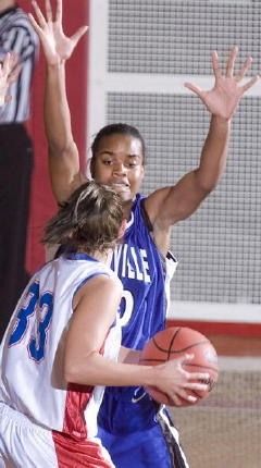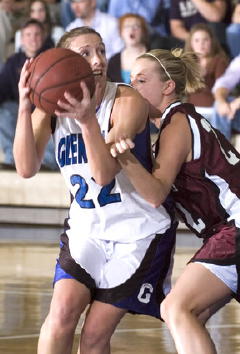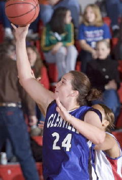 ![]() (L) Casey Taylor, 6'2" senior center of Sinks Grove WV, goes up for two during Saturday nights game against Concord. Taylor finished the night with 15 points. The Lady Pioneers won the game 77-60. Glenville's next game will be Monday night in Fairmont. (R) Freshman Melanie Oliver of Glen Allen, VA, intimidates OVC player during Thursday's victory. Oliver and fellow freshman Donita Adams have proven to be key additions to the Lady Pioneer team. (Photos by Drew Moody)