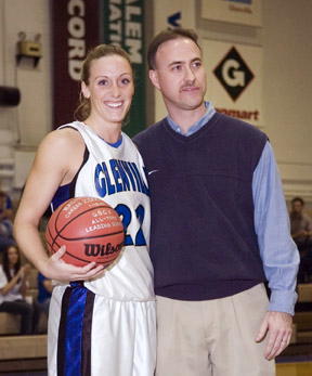 ![]() Rachel Redick and Coach Steve Harold during a brief pre-game ceremony honoring Redick's becoming the highest all-time scorer in women's basketball at Glenville State College during Thursday's contest against Ohio Valley University in Parkersburg. Redick was presented a game ball with an inscription honoring her achievement. Redick is just the eighth West Virginia Conference (WVIAC) player to surpass the 2,000 point mark. (Photo by Drew Moody)