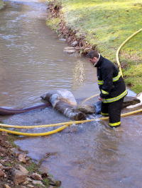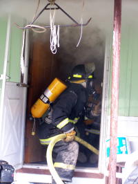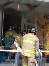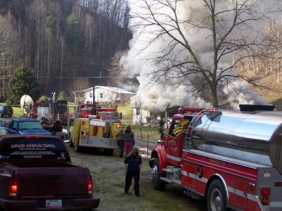 Elizabeth-Wirt firemen fight the fire (left) while Firemen kept the blaze under control, but when the structure ventilated, flames and smoke erupted. Firemen drafted water from the creek and shuttled tankers for more water to put on the blaze. The Grantsville Volunteer Fire Department dispatched three trucks to the fire at 8:12 a.m., with mutual aid being provided by the Elizabeth-Wirt VFD. The residence is located about three miles off State Rt. 16 on Annamoriah Creek, the Hur-Joker Road.