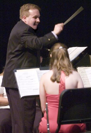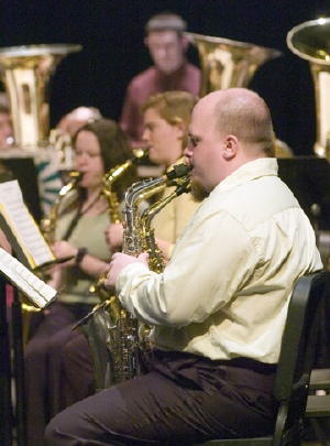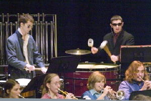 _______ By Drew Moody A Friday night concert, an annual Spring event for the Concert Band, culminated in an unusual and energetic rendition of 'Godzilla Eats Las Vegas' at the Fine Arts Center Auditorium. Costumes and props added to the suspense as some percussion members donned what looked to be "Men in Black" shades, the keyboard player wore a gold cape, and Godzilla even made an appearance throwing music around lumbering across the stage.