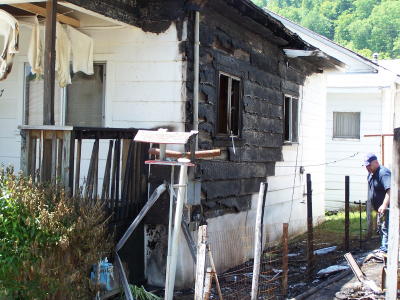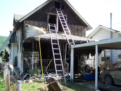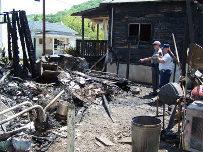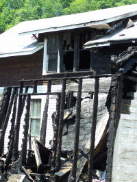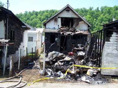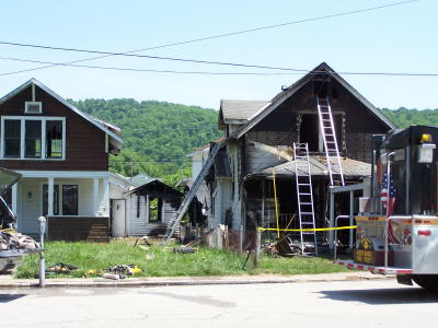 Neighbors believe fire started in this By Bob Weaver Following an early morning fire that destroyed two Grantsville structures and severely damaged several others, State Fire Marshal investigators spent much of Tuesday sifting through the ashes and taking statements regarding what appeared to be a suspicious fire. Fire Marshal Roger York said he could not comment on the investigation. York has been in Calhoun in recent weeks on several other suspicious fires that appeared to be arson. The fire totaled two structures, both reportedly owned by Bim Smith, and damaged at least five others. Houses occupied by Levi Fowler, T. C. Pritchett and JoAnn Shock were damaged, with heavy damage to two other dwellings, one owned by Jim Morris and the other the former Basnett house. Yesterdays fire in Grantsville, unlike other recent single-dwelling fires, had potential to reek havoc in a section of town occupied by dozens of old wooden structures built close together, including the nearby Rainbow Hotel, considered to be the town's biggest fire trap. Grantsville Fire Chief Craig Gherke said a really quick response and getting water on the blaze localized the situation. The first responder was on the scene operating in about six minutes, good for a 2 a.m. fire. Gherke expressed appreciation to the Arnoldsburg and Upper West Fork VFDs for helping fight the fire. Fireman Alan Bell, who was first on the scene, said "It was going good," on his arrival. "I think everyone knew this could be a really bad situation," said Assistant Chief Dave Johnson, who was grateful there were no injuries.