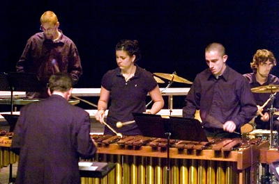 The Glenville State College Percussion Ensemble, directed by Photos by Drew Moody By Drew Moody Eight Glenville State College musical groups were featured in a Tuesday night performance at the Fine Arts Center. About 300 area residents attended the concert. Lloyd Bone, acting Fine Arts chairman, announced the recent approval of a new multi-faceted 4-year music degree, which includes a Bluegrass specialization, may be the only one of its kind in the U.S. Other areas of focus include voice and performance. Groups performing included the Glenville State College Jazz Band under the direction of Donna Maher. The Chamber Singers and Concert Choir performed under the direction of Carol Benton.