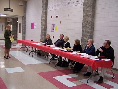 Principal Karen Kirby (left) discusses steps CM-HS is By Bob Weaver Calhoun school board members heard a number of positive steps being taken at Calhoun Middle-High School Monday evening, during a presentation of the school's improvement council. They also heard a report from principal Karen Kirby about costly and re-occurring vandalism in the high school boy's rest rooms. The special meeting was held at the Mt. Zion school, the board takes time each year to visit the county's three schools. Kirby spoke to the board about how the school is working on improvements following a state audit that gave some marks for poor performance. She discussed new classroom instructional strategies, weekly staff meetings and staff development focused on the OEPA audit. Kirby said administration and teachers are tackling how to prevent vandalism in the boy's restrooms, saying "fixtures are being pulled from the walls, including towel racks, dispensers, and paper holders." "Students kick the walls, making holes," she said, in addition to pulling basins and commodes from their mountings. Kirby said she recently had an assembly of all high school boys, discussing the problem, but "apologizing to the most of you who never do these kind of things." The principal said it is likely most of the damage is done by a half dozen students. The school has implemented tighter controls on restroom access while classes are in session, but that does cause problems for staff to monitor the situation. Kirby said the problem is not new, but it is getting worse. School board members participated in the discussion, offering suggestions.