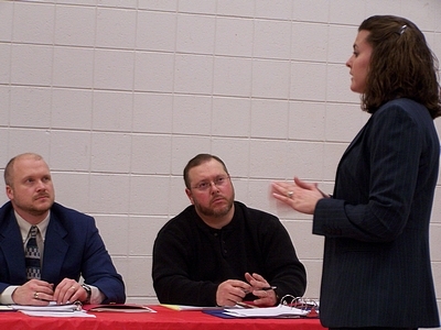 Board members Steve White and Mike Wilson (left) listen to Asst. principal Carla Taylor gave a report on the school's Respect and Protect program, which was initiated at Calhoun Middle and is now being used in the high school. Taylor said the program has been used in middle school long enough to verify marked improvement in student behavior. "Our Respect and Protect program is being adopted by the State Department of Education," Taylor said. Students get behavioral grades on their report cards, and are given rewards for good behavior, she said. Board members were reminded of the school's goals to improve academic performance, increase graduation rates, reduce student retentions, improve school effectiveness and increase the use of new technologies.