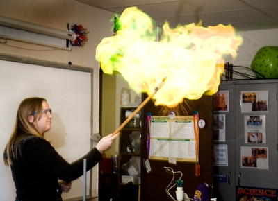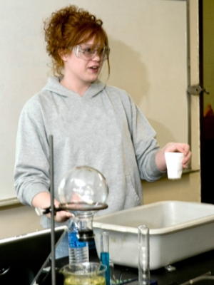 Kelly Brown, of Calhoun County, shows how the EDUCATION & COMMUNITY SERVICE Student ACS members visit middle and high schools, presenting a fast-moving series of science experiments with the hope the program may spark an increased interest in the sciences. Student demonstrations include: A hydrogen-filled balloon with a small amount of copper sulfate inside, placed over a small flame creates a green-tinted fiery explosion. Creating a vacuum in using two flasks - one over the other - pulls ammonia gas into water creating a color-changing "fountain effect." Empty soda cans, with some moisture inside, is held up-side-down over a flame, creates steam inside the can. If lowered into cold water, with the opening down, a vacuum is created and the rapid cooling crushes the can. Several pieces of Mentos candy rapidly delivered into a liter of Coke or Pepsi has an immediate violent reaction sending a stream 15-feet or more in the air. ENCOURAGE INTEREST IN SCIENCE