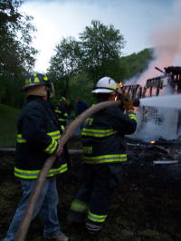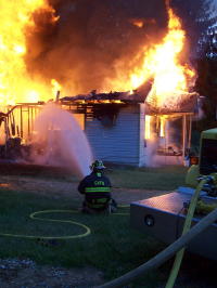 ... to bring the roaring fire under control The home of an elderly Pine Creek woman was completely destroyed by fire Saturday evening. The roaring fire generated extremely high temperatures, melting the side of a car and igniting a cellar house. Bettie Kisner, about 85, called 911 screaming, moments before fleeing her burning house, an initial report indicated she heard an explosion. She lost everything. Kisner, who lived alone, went to a neighbors house, expressing concern about her two dogs. Firemen and Calhoun EMS personnel spent a considerable time capturing the frightened animals. Grantsville firemen received the first call at 7:35 p.m. The Arnoldsburg VFD also responded with water tankers.
