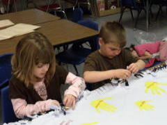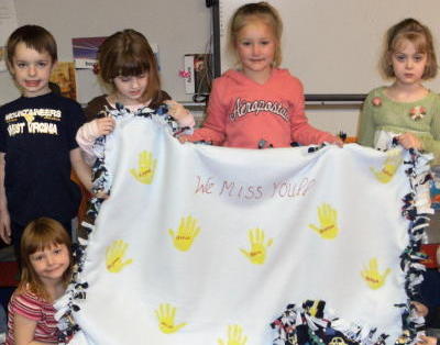 By Dotti Nemitz Students in Mrs. Prusack and Mrs. Johnson's Arnoldsburg Kindergarten class have been missing one of their classmates, Waylon Carter. Waylon has been seriously ill, has had much of his small intestines removed and is currently awaiting a transplant. He has been hospitalized for several weeks in Morgantown and was transferred to a Pittsburgh hospital this past week. Mrs. Johnson thought he might enjoy a nice cozy quilt put together by his classmates. The quilt has each classmate's hand print, name, and the message, "We Miss You" printed on the back. Waylon was surprised with the guilt this past weekend.