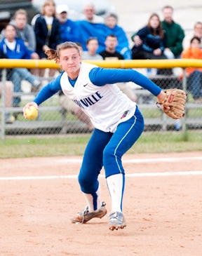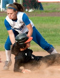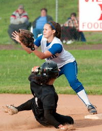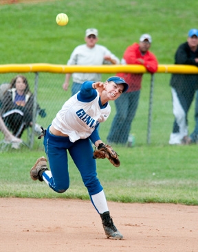 Karly Eskew, shortstop, snags an infield In the end it appeared Wesleyan's batting prowess gave them a slight edge at bat. They looked hungry; the Lady Pioneers looked tired. There were two questionable calls against Glenville that may have tilted the second game, according to spectators affiliated with a WVIAC conference team not involved in the finals. However, debatable referee calls are common to all sports.