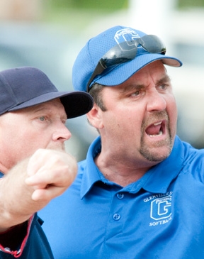 Head coach Rick Moore and one of the umpires Coach Rick Moore had only good things to say about his team and the season. The girls set a new record at Glenville with it's first winning season ever netting 21-13 in the conference and 25-24 overall. Four Lady Pioneers were named to the WVIAC All-Tournament team. Those players were: Leanne Harris, Kohle Maynard, Brittney Handley and Mandy Parkulo. Kohle Maynard (FB) and Brittney Handley (OF) are freshman members of the squad, hailing from Madison and St. Albans, WV respectively. Leanne Harris (2B) is a junior from Windsor, Ontario. Mandy Parkulo (P) is from Shady Springs, WV.