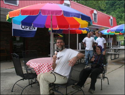 ![]() Story and photo by Maggie Volkwein Roxy's Sugar Shack, pizza restaurant, ice cream parlor, and video arcade just celebrated their grand re-opening. Flooding in May put the Arnoldsburg business under four feet of water. The Sims family from Arnoldsburg are opening their restaurant with new hours - 4:00 to 9:00 p.m. each day, except Wednesday. They are serving tacos, hot dogs, pizza in the round or by the slice, and the famous Arnoldsburger. "Only the best for our customers," says Linda Sims, who leans on the spotless counter while the 1950's music with its growly sax and dreamy harmonies drift through the video arcade. "We're making that West Virginia hot dog sauce everybody likes at all the festivals around here. The Ole Village Bakery in Arnoldsburg makes the pizza crust," Linda said. "My husband Pete and the kids, Daniel, Darren, and Roxy all pitched in after the flood. Pete was in the restaurant bailing, absolutely bailing the place out." "This past year has been the hardest in my life. Well, we came to settle down in Calhoun County, and we love it here. We're not going to let that flood get us down," she said. Pete and Linda's kids move back and forth busily, handing us our hand-dipped ice cream cones. We eat them outside under the huge rainbow-colored umbrellas. Last year, Linda hung little flags on the fence. The flood waters came clear up to the little flags. The battered, worn flags from last Independence Day are still flying, just like the cleanup team and all that has gone into the re-opening of Roxy's Sugar Shack. Ice cream, anyone?