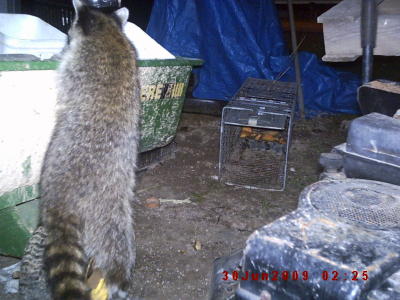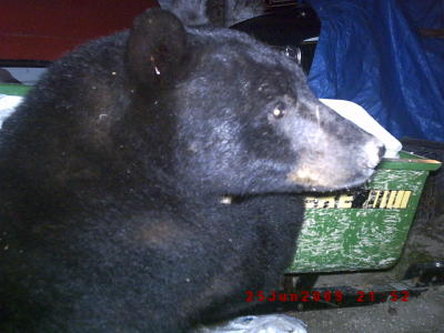 A game camera on Sand Ridge Hill belonging to Marty Roberts caught two intruders, a wandering bear enjoying the trash bin and a raccoon avoiding a live trap. The Roberts' wonder if it could be the same bear caught on other area cameras.