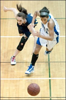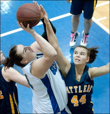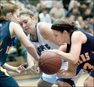 Kristen Golden did it all Monday evening, including Story and Photos by Drew Moody Kristen Golden had her top game of the season, and she did it all. Leading the team in scoring with 35 points, she was all over the court with blocks, steals, outside shots, assists, and rebounds. Golden shot a deadly 68-percent from the floor. There was no stopping the Lady Pioneers as five teammates hit double-figure scoring. Kim Stephens and Beth Deren, both solid players were red-hot Monday night scoring 13 and 15 respectfully. Donita Adams had 25 on the night, while Suzi Harvey chipped in 11.