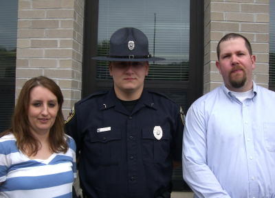 Officer Garrett graduates academy, shown above with A Grantsville policeman has completed training at the WV State Police Academy. Nineteen-year-old Joey Garrett of Stumptown just completed the 145th Basic Police Training Class at the WV State Police Academy in Institute, a course that extended from January 3 to April 22. Garrett, a 2010 graduate of Gilmer County High School, completed a two-year criminal justice program at the Calhoun-Gilmer Career Center. Garrett, who has wanted to be a law enforcement officer since his childhood, will return to his position as a patrolman for the Grantsville Department. Grantsville Police Chief, Jeff Starcher said, "He [Garrett] is the first police officer to complete the WVSPA for the Grantsville Department since I did on December 19, 2008."