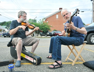 When you don't have a seat, an instrument case will do By Drew Moody/Story And Photos Bluegrass, Old-Time music, and square dancing were in abundance at the annual West Virginia State Folk Festival in Glenville, last week. A newly completed downtown pedestrian mini-park greeted visitors, replacing what previously was a gravel parking lot eye-sore. The annual event draws a mix of old and new musicians each year. For many locals it's a county-wide homecoming of sorts.