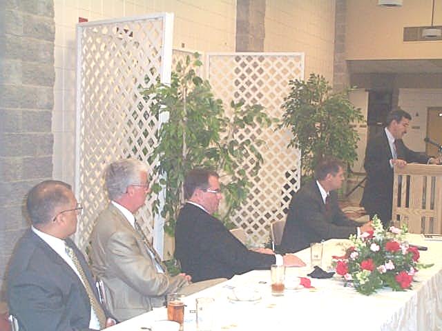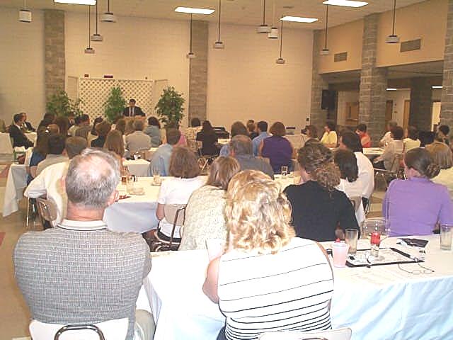 ![]() School administrators listen to Dr. Bitterbaum Principal Mike Offutt, who was the Master of Ceremonies, said "Tonight we gather to honor the best of the best. The students whom we honor this evening have reached the highest levels of academic achievement among the Class of 2002." Principal Offutt and Dr. Erik Bitterbaum recognized the honor students, including David Albaugh, Aslea Bush, Shaina Cain, Nikki Church, Evan Cunningham, Melanie Davis, Amanda Frederick, Erika Harold, Darris Hupp, Tiffany Jones, Danielle McBride, Sonja McKown, Misty Perkins, Jennifer Siers, Erin Smith, Dustin Wagoner, Natalie White and Shane Yeager. CHS students nominated teachers and staff for special recognition. "People who have made a difference in their lives," according to Offutt. Superintendent Ron Blankenship and Dr. Bitterbaum gave the awards to Rosemary Ailes, Larry Baker, Pam Bartlett, Greg Cartwright, Faye Chambers, Renee Deditch, Amy Fitzwater, Deb Goff, Patricia Hicks, Cheryl McCallister, Susan Pitts, Carol Sue Stump and Tammy Yoak. Rev. Tim Davis gave the invocation, with special music provided by Larry Cole and the dinner prepared by the Mt. Zion UM women. The event was underwritten by the Grantsville Lions Club, Calhoun Banks and Minnie Hamilton Health Care Center. The planning committee, Robert Bonar, Mike Offutt, Brenda McBride and JoAnn Stevens. |