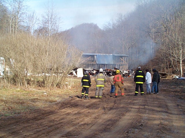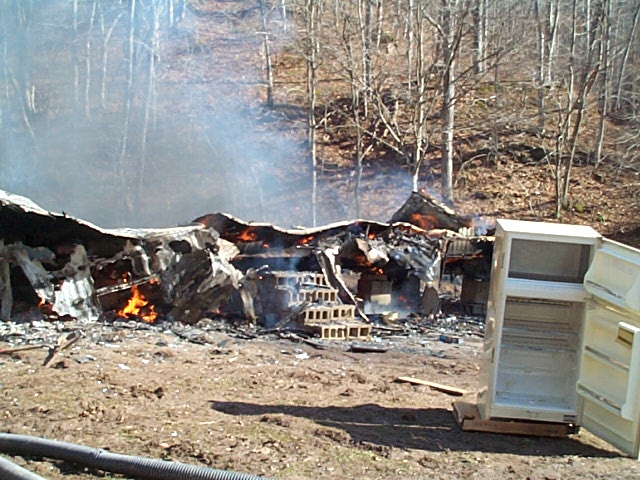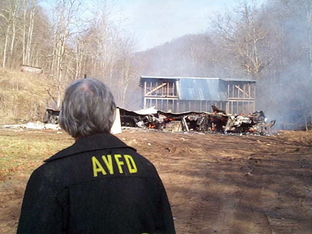 By Bob Weaver Over a thousand rounds of ammo exploded in a mobile home fire off Sinking Springs Road Sunday morning. "I had thirteen guns burn up with the shells," said owner Don Simmons. The trailer was fully engulfed when discovered by family members in Simmons Hollow (Hughes Run). Rounds of shotgun and rifle shells continued to explode around the home for nearly 45 minutes. Arnoldsburg Fire Chief Bill Jones said several small canisters of propane gas also exploded. The home was a total loss before the AVFD arrived, although a pumper was sent into the narrow hollow. Don Simmons said he was in the process of moving into the mobile home. He told Chief Jones the fire seemed to have started near a furnace. There was no insurance. Arnoldsburg VFD sent three trucks and eight men to the fire. Calhoun EMS also responded.