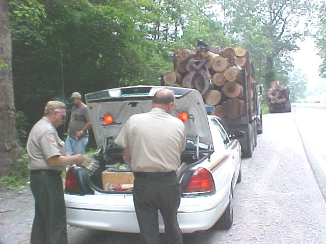 ![]() West Virginia Department of Highways weights and measures crews were stopping logging trucks on U.S. 33-119 east of Spencer while the legislature contemplated overweight coal trucks. The coal interests are wanting to increase weights to 120,000 pounds, but the proposal would not affect logging trucks. However, the state could increase the intensity of weight enforcement on all haulers. |