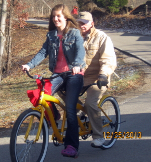 ![]() Photo by Kaye Yoak Carissa Yoak and her 81-year-old grandpa Robert Yoak of White Pine rode a bicycle built for two over the Christmas holiday, a gift to the family from Kaye Yoak. "The kids all love to ride bikes and had a blast Christmas morning riding this one even though it was a bit chilly. Christmas is for the young and old alike," said Yoak.