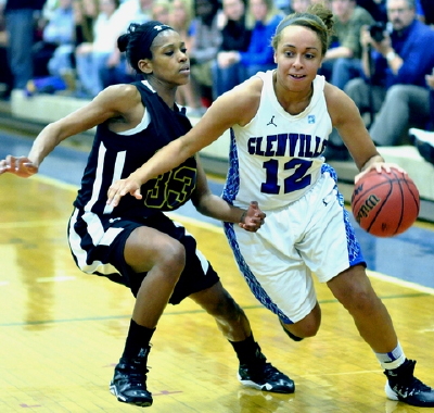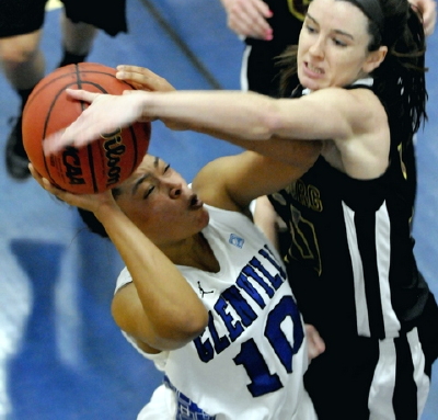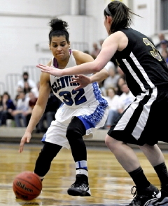 Ginny Mills (left) works the ball near the top of the Simmons led Glenville's scorers with 17, while Mills and Huffman picked up 13 apiece. Kenyell Goodson picked up 9 points with 5 assists. Keyanna Tate scored 8, and Ashleigh Fossett scored 7 with 4 assists. The Lady Pioneers shot 35-percent from the floor. Bloomsburg had four players in double-figures with Noack and Ford netting 27 and 19 respectively. The Huskies shot 55-percent from the floor, and nearly 58-percent of their 3-point attempts, compared to Glenville's 44-percent. The Lady Pioneers lose eight seniors this year and will be in a rebuilding phrase in the coming months. Lady Pioneers Coach Charles Marshall he'd be happy with new recruits who gave half as much as this Glenville team has all year. "There's no way I can replace these young ladies," he said, praising the seniors. "They have been the heart and soul of this team all season long." "They didn't quit and they fought to the end," he said of the loss. "We had a shot," Marshall added without regret. Marshall had a phenomenal season as a first year head coach ending with a 29-4 overall record. The team was declared season champions as top team in the Mountain East Conference and captured the conference championship recently in Charleston, WV.