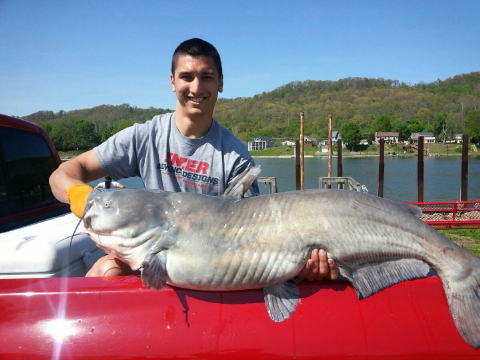 Auston Hoffman of Milton, West Virginia, holds the state A state record blue catfish was caught last year from the Ohio River, according to Frank Jezioro, Director of the West Virginia Division of Natural Resources. The record blue catfish was caught by Austin Hoffman of Milton, West Virginia. Hoffman caught the 47.75-inch, 52.95-pound fish using cut bait from the Ohio River below R.C. Byrd Dam April 26, 2014. Hoffman's catch establishes a new West Virginia record for length and weight. The previous record was a 43.9-inch, 44.5-pound blue catfish caught by Mark A. Foster. Eating fish out of West Virginia rivers is with caution and limitations related to the amount of mercury in the fish, mercury coming mostly from fossil fuel power plants. Anglers who believe that they have caught a state record fish should check the record listing in the 2014 Fishing Regulations brochure. The brochure also outlines the procedure to follow for reporting their catch. This information is also available online at www.wvdnr.gov |