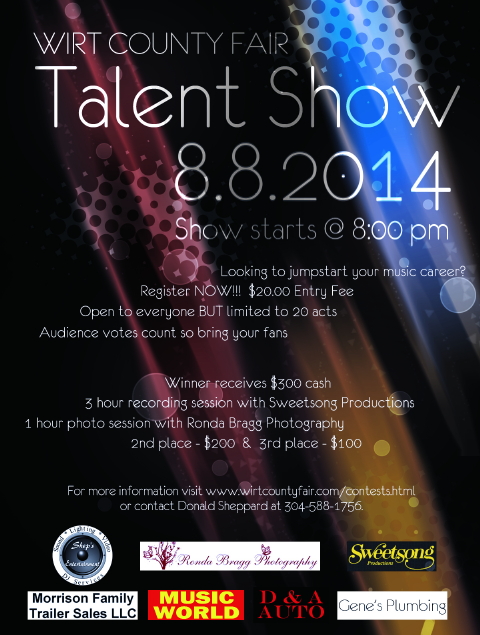 | Attention up and coming music artists. Looking to jump start your music career? Look no further, as Shep's Entertainment presents the 2014 Wirt County Fair Talent Show, Friday August 8, 2014 starting at 8:00 p.m. The first place winner will take home a 3 hour recording session with demo CD courteous of Sweetsong Productions. Ronda Bragg Photography will provide a 1 hour photo session for those creative images for promotions, an album cover, or a website. Finally, thanks to our sponsors, D&A Auto, Gene's Plumbing, Music World, and Morrison Family Trailer Sales, the winner will receive $300 to put towards their dream. The runner-up will take home $200 cash and third place will receive $100. Judging is based on vocal ability, originality, stage presence, crowd reaction/participation, and talent. Be sure to bring your family & friends as audience voting will determine the winner. Only $20 to enter, but hurry space is limited to the first 20 acts. Complete rules and entry forms are available at wirtcountyfair.com