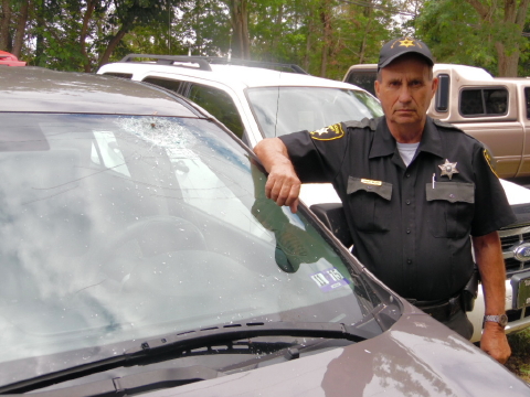 Officer Groves new vehicle damaged An air saw trimming trees and brush along a power company right-of-way sent debris into a parked vehicle on Pleasant Hill, breaking the new car's windshield. Calhoun Home Confinement Officer Bob Groves was at home when the cutter came through, within about 75 feet of his house and parked vehicles.