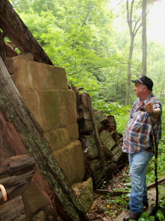 Descendent Ralph Carpenter studied the tightcarved and etched logs that were used for the cabin |