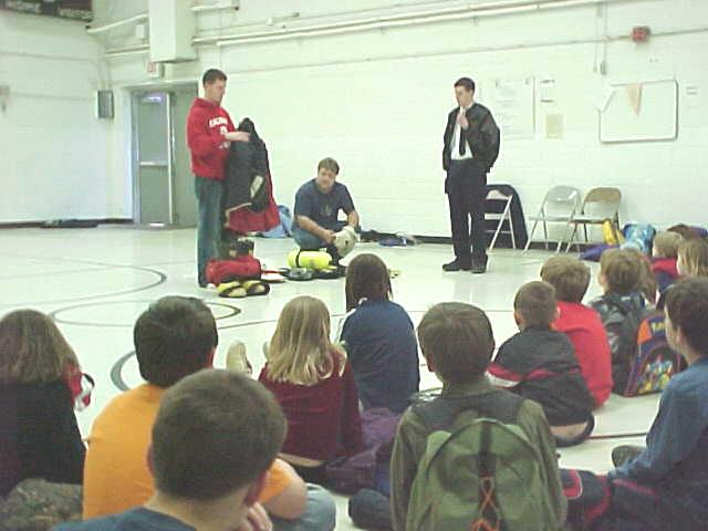 | Dan Cosgrove On Tuesday, February 4, the Arnoldsburg's After School Program was visited by the local fire department. Members of the Arnoldsburg Fire Department brought two trucks and all the gear used to fight fires. Assistant Chief Joe Tanner, Captain Justin Metheney and fire fighter Derek Wright gave valuable lessons to the students in case of a fire.