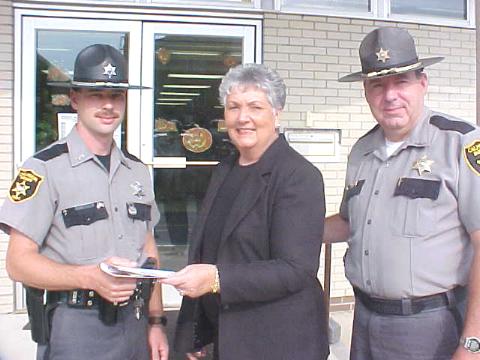 (L toR) Deputy Charlie Richards receives scholarship, Calhoun native, Jean "Bertha" Shock Cromley, is a woman with a mission. "My goal is to come back to Calhoun and make a difference in the community," she said. Monday she presented a $5,000 scholarship to allow new Deputy Sheriff Charlie Richards attend West Virginia State Police Academy. Richards is anticipating on entering the State Police Academy in January. Sheriff Allen Parsons and Deputy Richards said "We are very grateful to Jean for this help." Her scholarship will pay for tuition, wages, clothing and expenses "This will make it possible to get the training," said Deputy Richards. Cromley, a resident of Fort Myers, Florida, is the daughter of the late Willard and Lucille Roberts Shock of Calhoun, who both died of cancer. Since retiring seven years ago from General Electric, she has spent much of her time helping cancer victims. She is the owner of Panache Total Image, which specializes in wigs for people who lose their hair, to illness. Cromley is in the process of organizing a group of former Calhoun residents who want to help with projects in the county. She said the announcement will be made in a few months. She may be reached at 2307 LaSalle Ave., Fort Myers, FL 33907, or by calling 239-634-1140. She has three brothers, Bill, Jack, and Larry Shock, and three sisters, Judy Morton, JoAnn Shock and Tammy Moore. Cromley is a graduate of Calhoun High School.