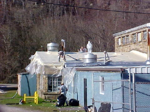 ![]() Roofers are fixing about 12,000 square feet of the old NYA building on Route 7 this week. The building has been abandoned since B. F. Goodrich left the area several years ago, and numerous leaks have appeared. A $30,000 Governor's Partnership Grant obtained through the Calhoun Commission and Del. Bill Stemple will help the situation. The polyurethane replacement is being done by American Star Specialty. |