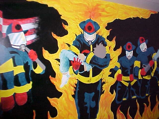 The wall murals have been painted by artist J. R. Dennison, of Stump Funeral Home, at the fire house, Grantsville Volunteer Fire Department.