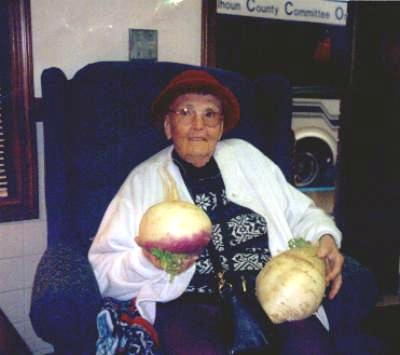 Senior citizen Elva Yoak of Grantsville displays a couple large veggies, a turnip weighting 3 1/4 pounds and a radish weighing 3 3/4 pounds, both grown by Arnold Yoak