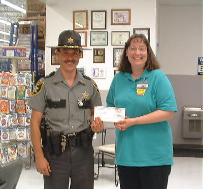 ![]() Deputy Ballengee rceives check from Wal-Mart Calhoun's Chief Deputy Sheriff Carl D. Ballengee and his police dog partner Officer Kahn received help from Wal-Mart Foundation yesterday. The Foundation presented a $1000 check at Spencer's Wal-Mart to help buy a bullet-proof vest for Kahn. Ballengee said Mark's Towing of Spencer-Walton also donated $200 toward the vest.